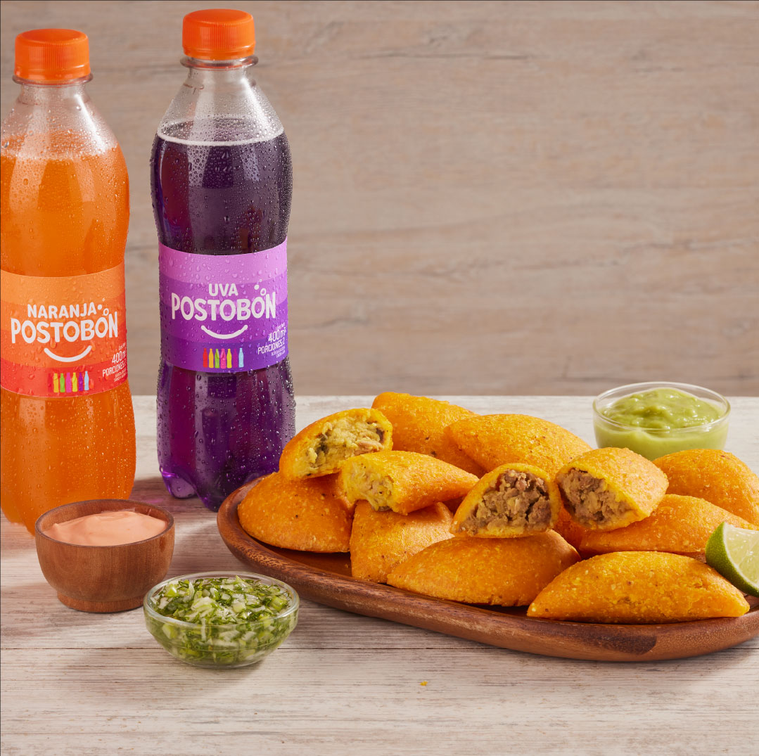 10 empanadas de maíz de 50grs de carne o pollo + 2 gaseosas personales de 400ml Postobon.