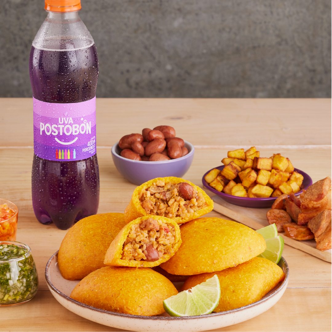Empanada de maíz peto con deliciosa carne de cerdo desmechada, chorizo de cerdo, chicharrón, frijol, plátano maduro y arroz con guiso de la casa.