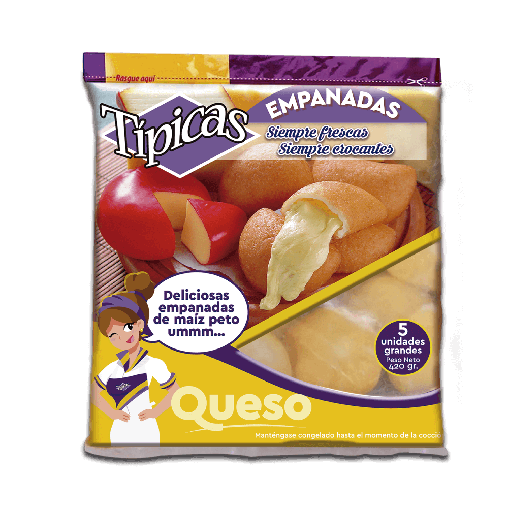 Empanadas congeladas de queso grandes x5u. Empanadas prefritas congeladas de maíz peto con queso doble crema, 5 unidades.