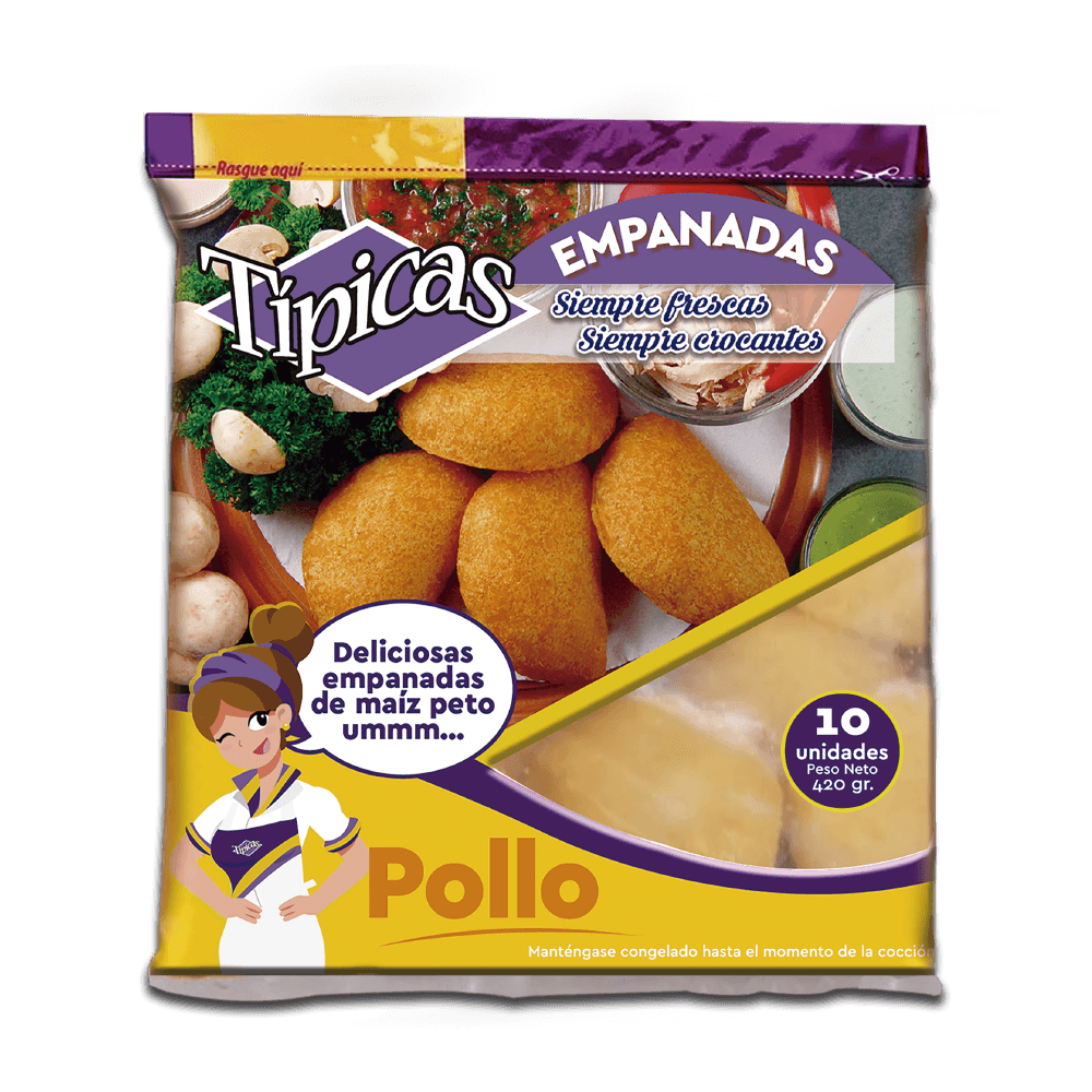 Empanadas Medianas de Pollo Congeladas x 10u. Empanadas prefritas congeladas de maíz con pollo, champiñones y salsa bechamel, 10 unidades.